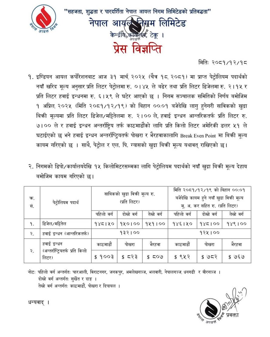 Kathmandu: Nepal Oil Corporation has reduced the price of fuel. The price of Diesel, Kerosene and aviation fuel has been reduced with effect from 1 AM on Monday.
